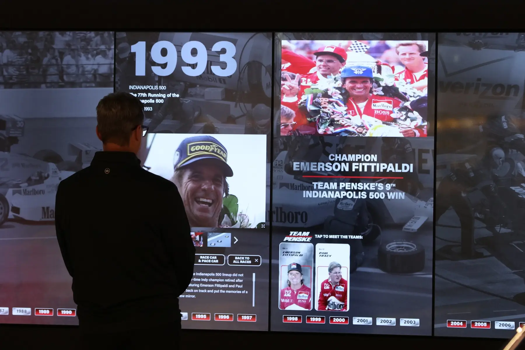 How do you transform decades of motorsport history into an interactive experience worthy of the Penske legacy? The technical restrictions were formidable: 10 interconnected monitors across five zones, each zone running on separate computers, yet appearing as one unified experience. Team Penske’s story spans from Roger Penske’s first Indianapolis visit in 1951 to their record 20th Indy 500 victory in 2024—and every pixel had to align precisely across independent systems.